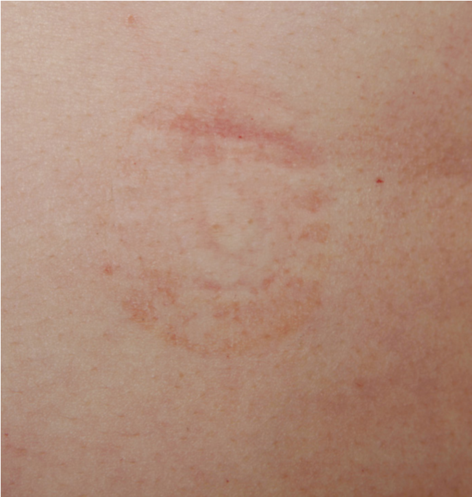 A. Rødme, der er afgrænset til området, hvor plasteret har siddet