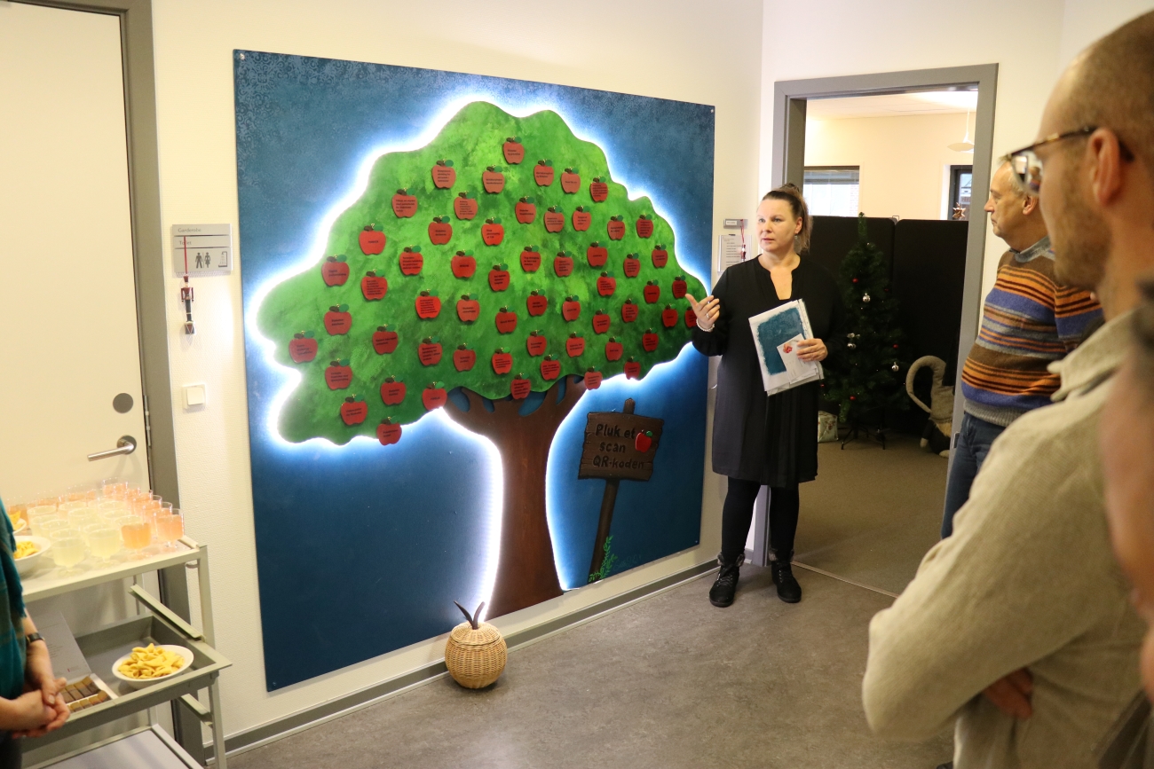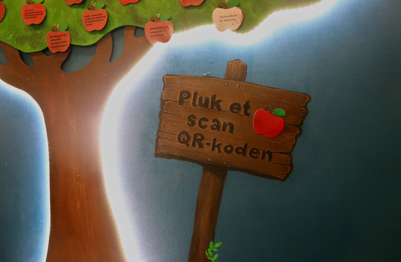 Æblerne (projekterne) er alle forsynet med en projekttitel på æblets forside. På æblets bagside er der en QR-kode som leder dig videre til SDCN’s hjemmeside med information om de enkelte projekter.
